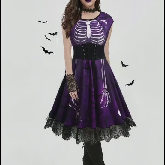 Vintage-Inspired Halloween Dress with Skull & Bat Design, Lace Trim, and High Waist - Perfect for Parties